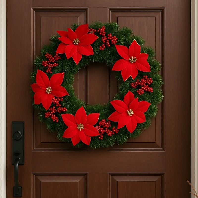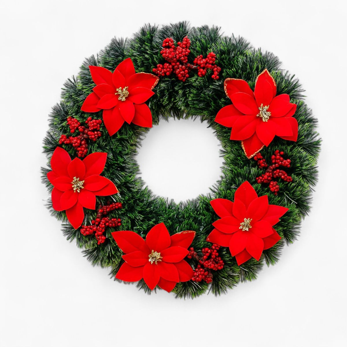 Această coroniță decorativă de Crăciun, cu diametrul de 38 cm, este un ornament elegant și tradițional care aduce farmecul autentic al sărbătorilor în orice spațiu.