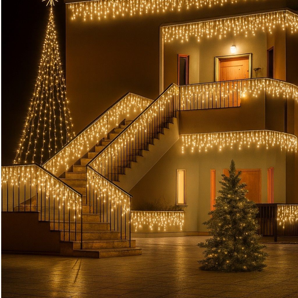 Instalaţie de Crăciun tip „franjuri” 12 m – 300 LED alb cald – interior & exterior – conectabilă Această instalaţie cu design „franjuri luminoşi” reprezintă o soluţie premium pentru decorarea spaţiilor în sezonul festiv – de la faţade ample de clădiri, balcoane întinse, arcade de grădină, zone de recepţie în hoteluri şi restaurante, până la ambientul privat care doreşte un efect deosebit.