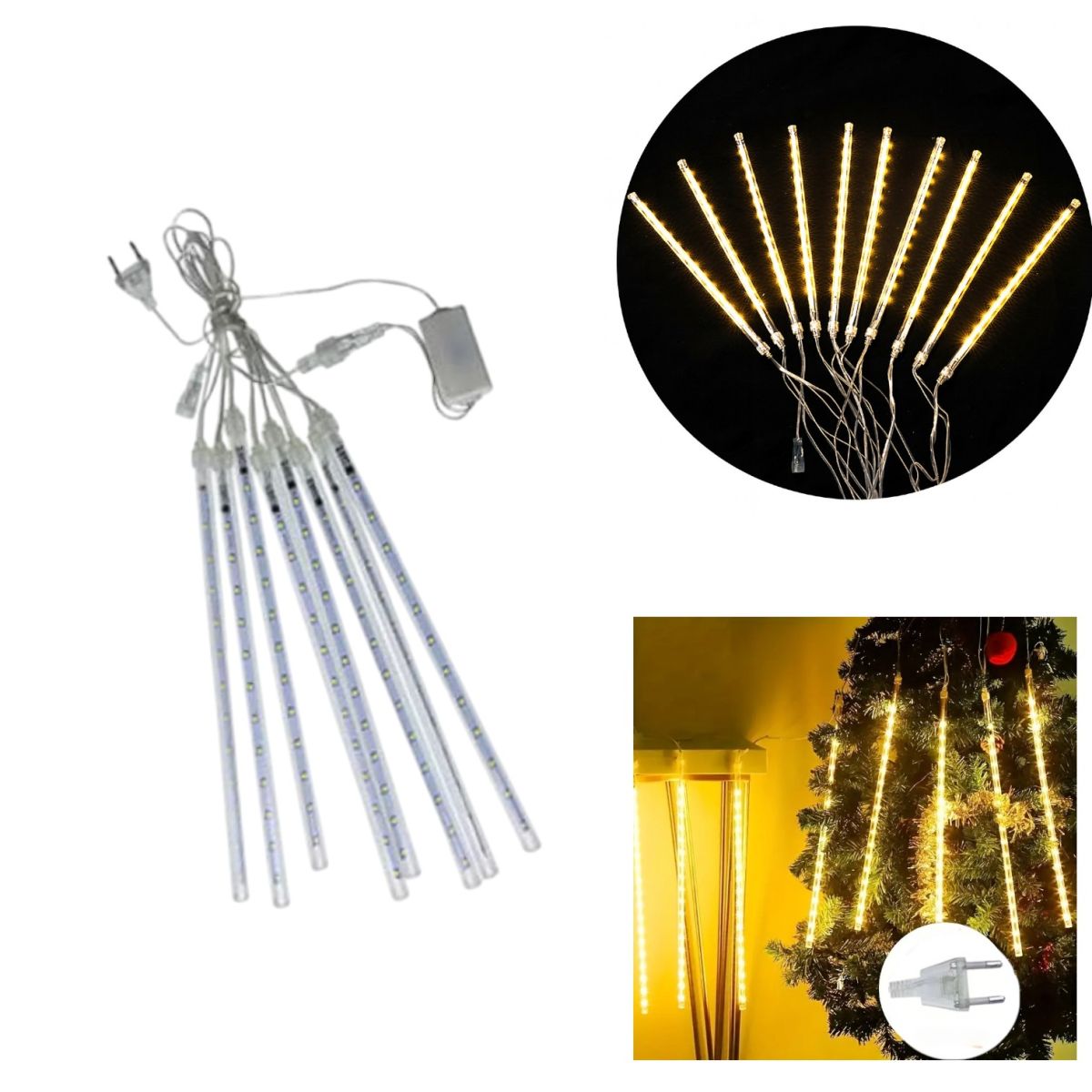 Instalațiile de Crăciun tip „Ploaie Meteoriti” sunt o alegere fantastică pentru a transforma orice spațiu într-un loc magic și festiv, perfect pentru sărbătorile de iarnă. Aceste instalații luminoase sunt concepute pentru a crea un efect spectaculos de „stele căzătoare” sau ploaie de meteoriti, prin iluminarea verticală a cablurilor luminoase, oferind o atmosferă unică. Setul include 8 bucăți de instalații, fiecare cu o lungime de 50 cm și LED-uri care emit o lumină caldă, perfectă pentru a adăuga o atmosferă primitoare și plăcută în perioada Crăciunului.